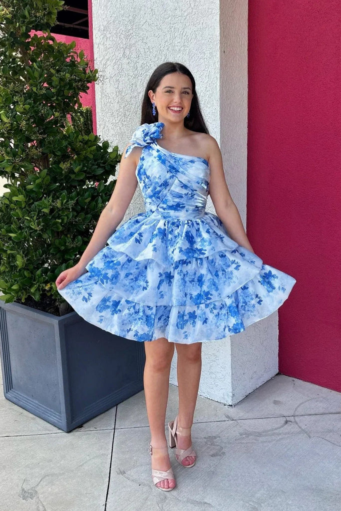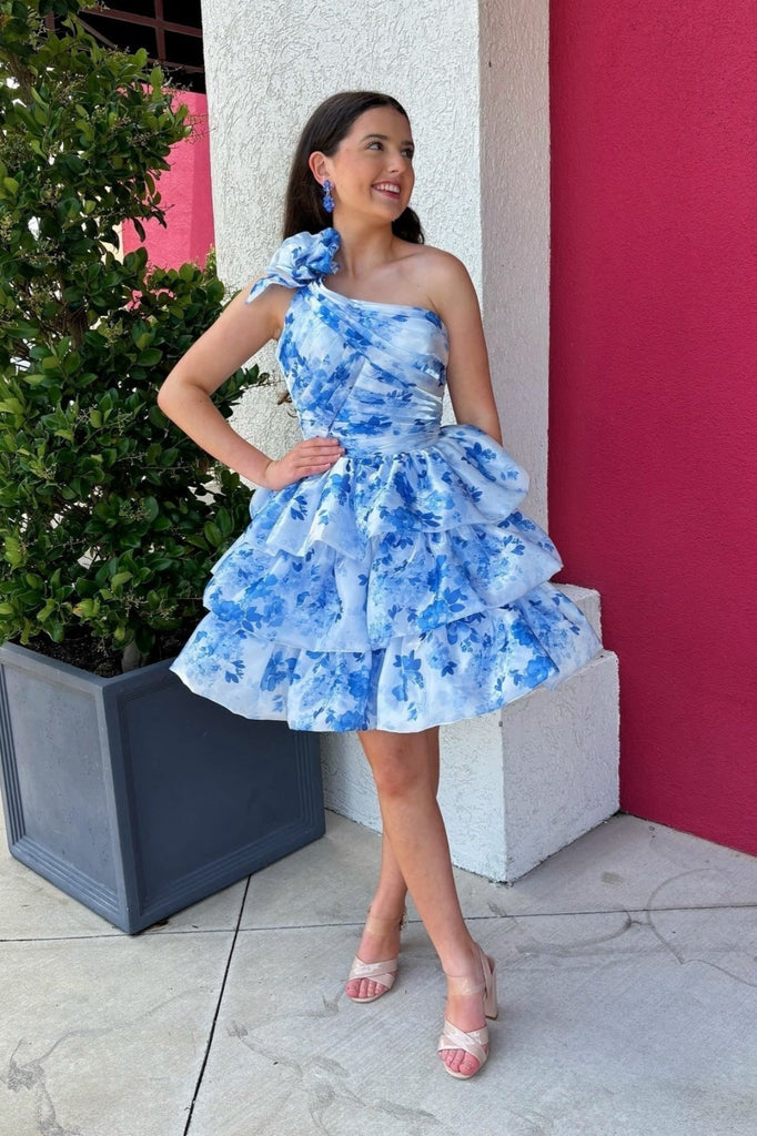 A Line One Shoulder Short Blue Floral Prom Dresses, Blue Short Floral Formal Homecoming Dresses