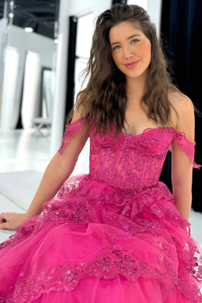 Off the Shoulder Pink Lace Layered Long Prom Dresses, Pink Layered Lace Formal Evening Dresses
