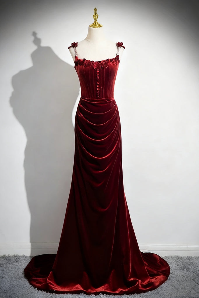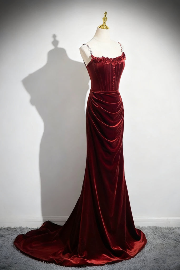 Spaghetti Straps Burgundy Mermaid Velvet Long Prom Dresses, Burgundy Mermaid Long Formal Evening Dresses