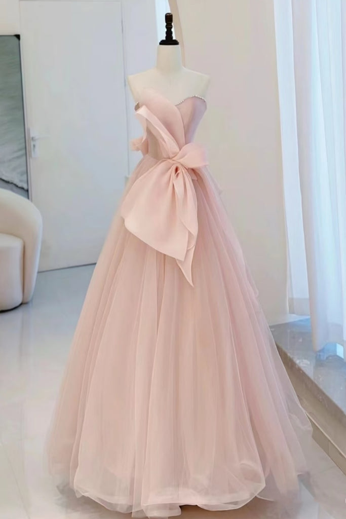 Strapless Light Pink Tulle Long Prom Dresses, Light Pink Tulle Long Formal Evening Dresses