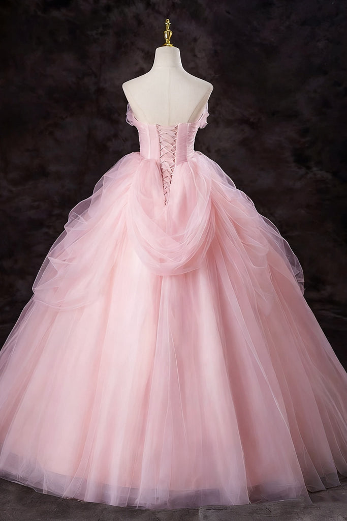 Strapless Pink Tulle High Low Long Prom Dresses, Pink Tulle Long Formal Evening Dresses