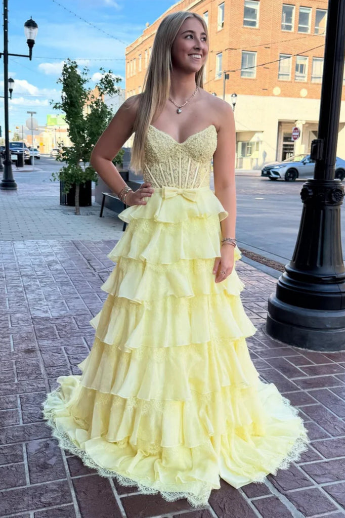 Sweetheart Neck Pink Yellow Layered Lace Prom Dresses, Pink Yellow Layered Lace Formal Evening Dresses