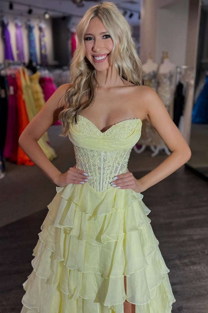 Sweetheart Neck Yellow Lace Layered Long Prom Dresses, Yellow Lace Layered Long Formal Evening Dresses